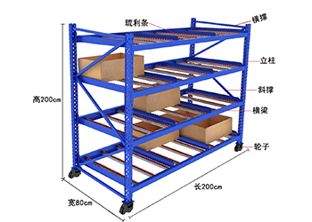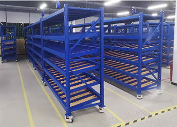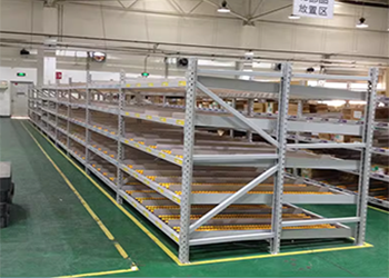 Fluent shelf is a lightweight first in first out shelf, where goods are placed from the back and taken out from the front. It is usually used in conjunction with standard plastic turnover boxes or cardboard boxes, with a space utilization rate of 50%. This shelf can be used independently as a unit or in combination with multiple units, and is widely used in warehouses, factory assembly workshops, and various distribution centers.